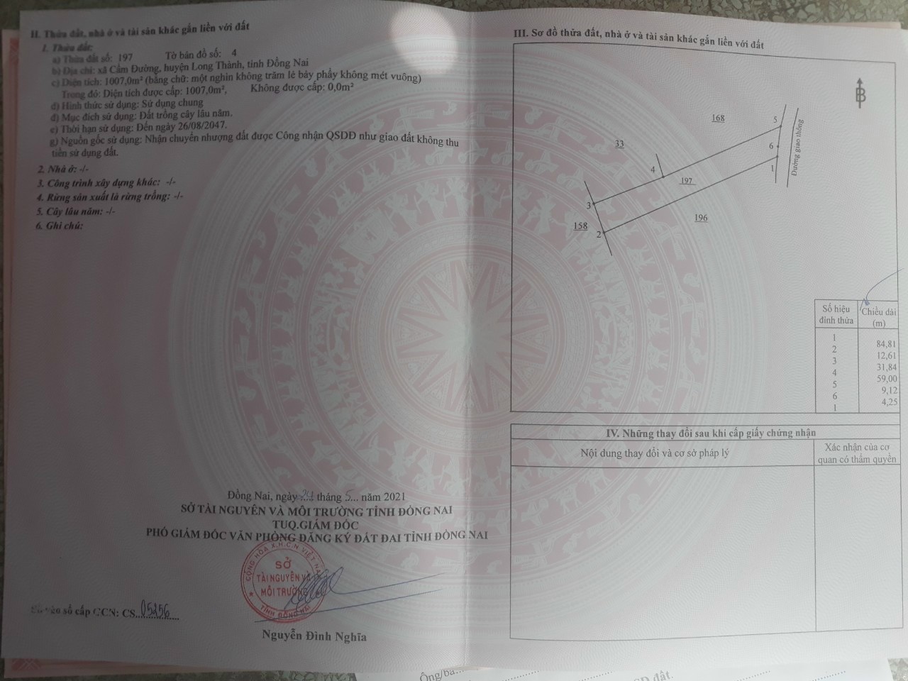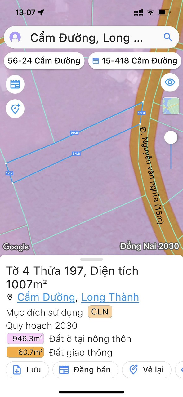 Cần bán miếng đất mặt tiền hiện hữu đường Nguyễn Văn Nghĩa xã Cẩm Đường, huyện Long Thành, tỉnh Đồng Nai thuộc tờ số 4 thửa 197.