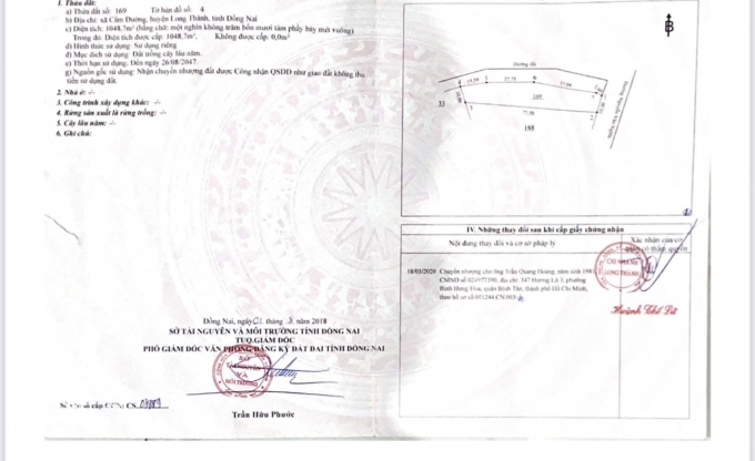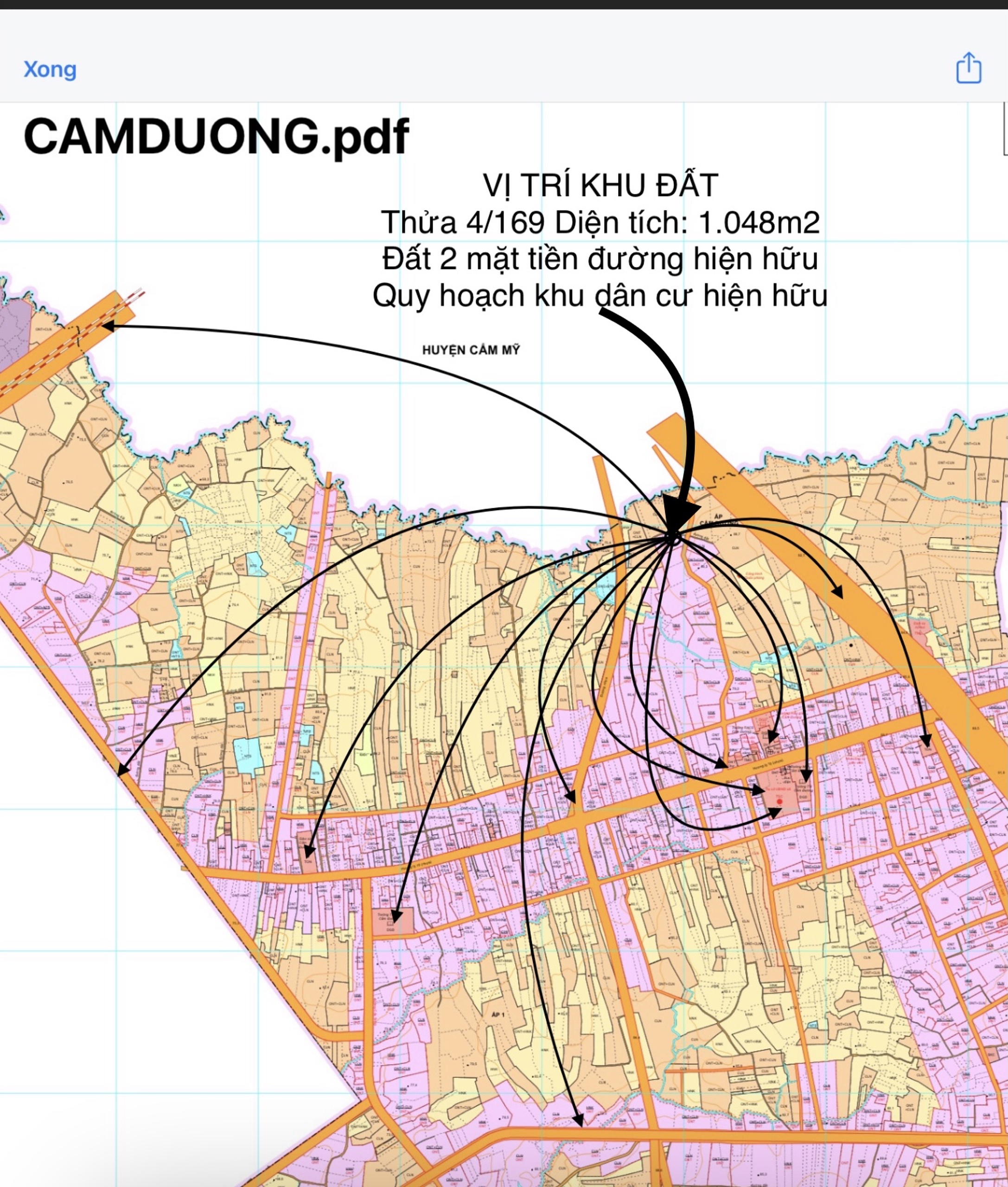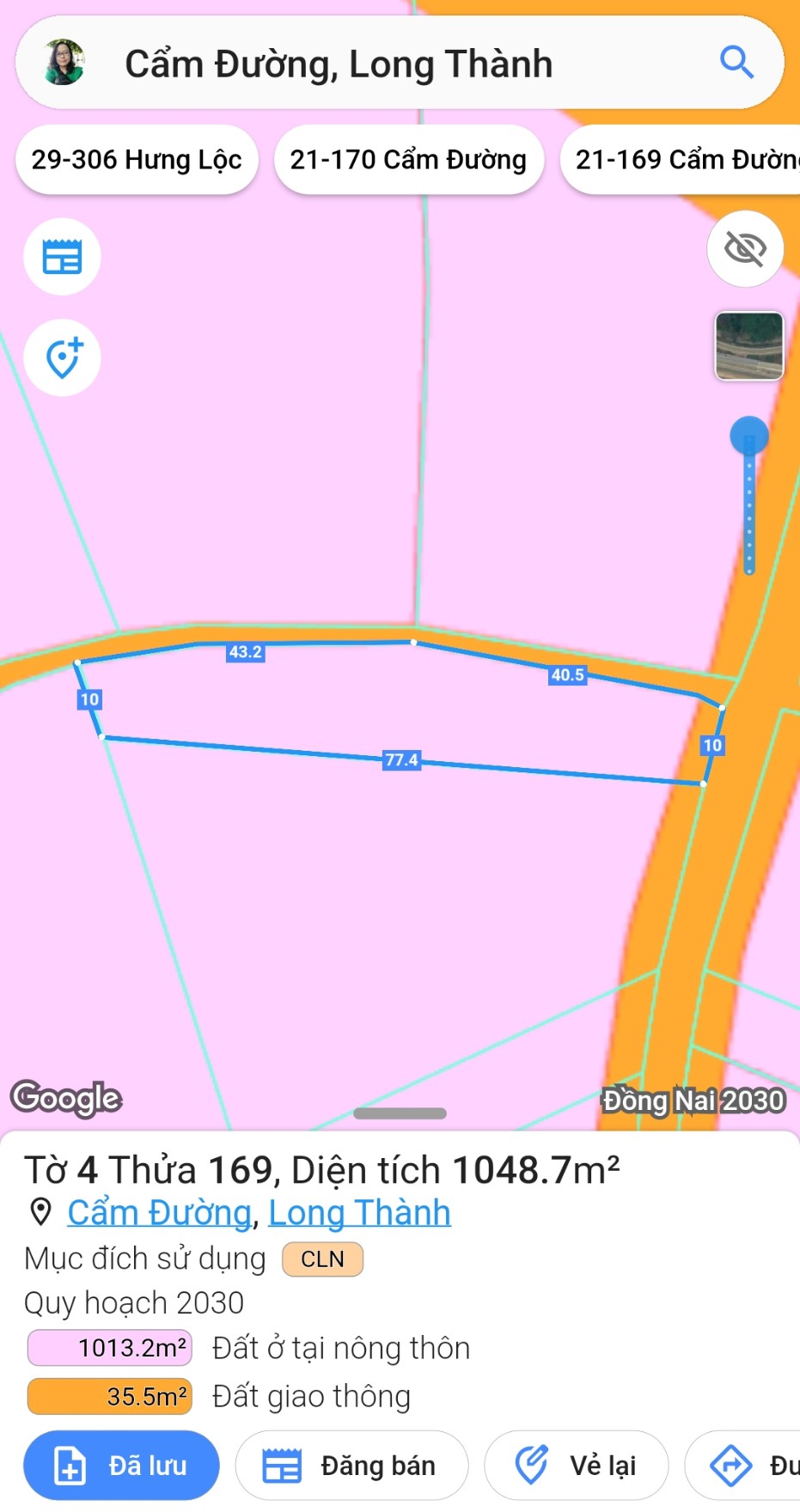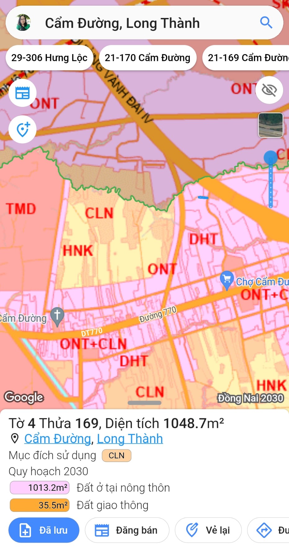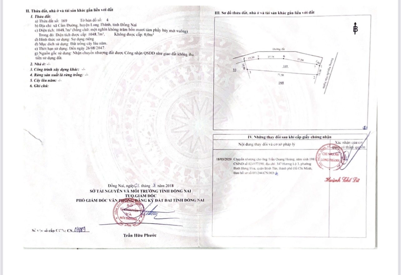 Tổng diện tích 1047,7m2 thuộc tờ bản đồ số 4 thửa 169 xã Cẩm Đường, huyện Long Thành. Đã có 830m đất thổ cư, phù hợp phân lô tách nền nhỏ.