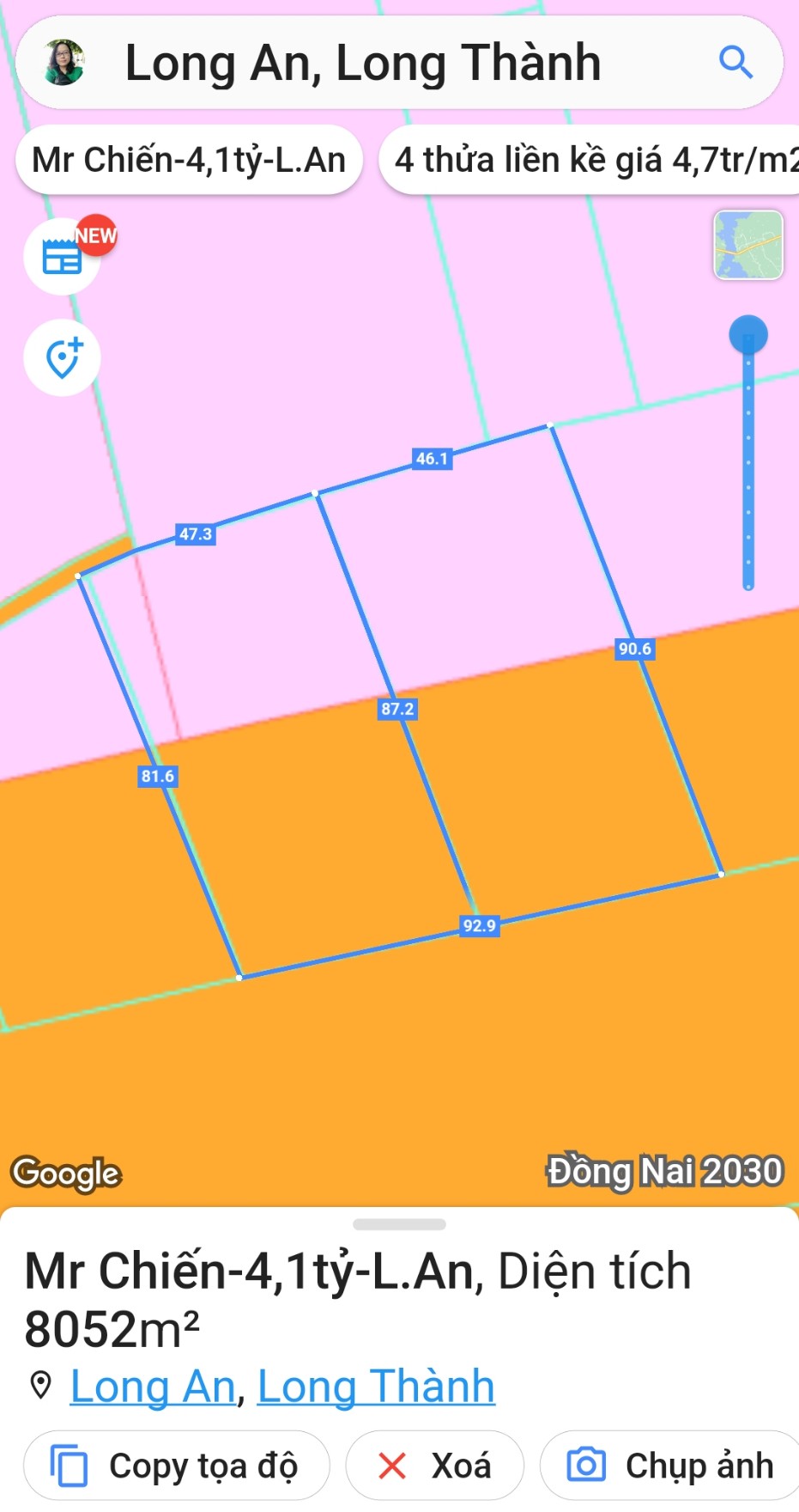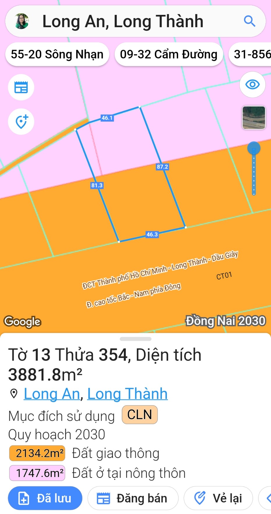 Diện tích 46m3 x 81m3 (mặt đường sau dài 46m, trên google map đã thể hiện đường hiện hữu)