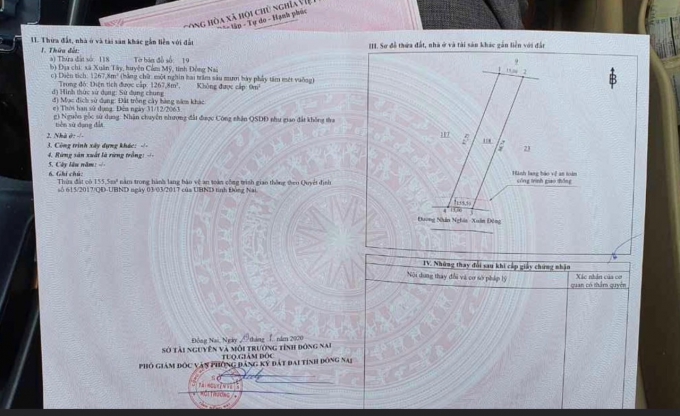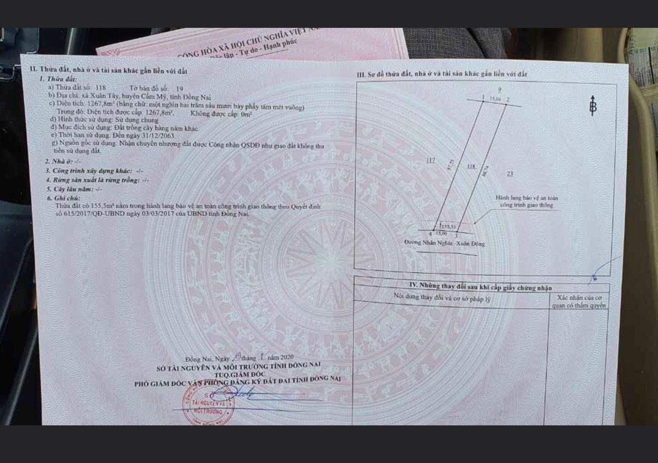 Chuyển nhượng 1267,8m2 đất mặt tiền đường Nhân Nghĩa - Xuân Tây, huyện Cẩm Mỹ.