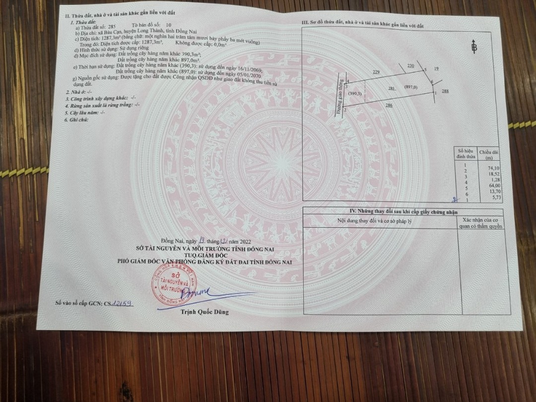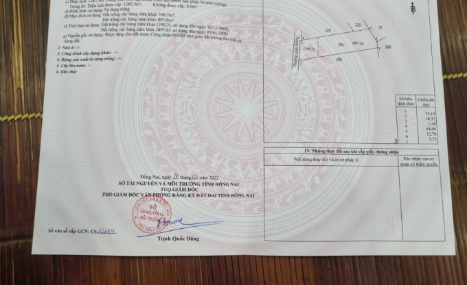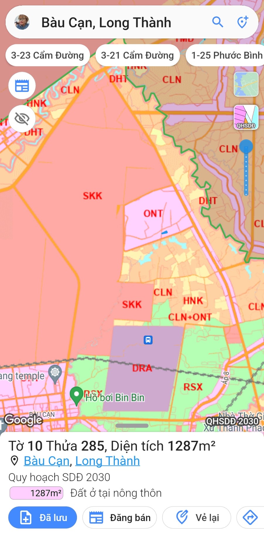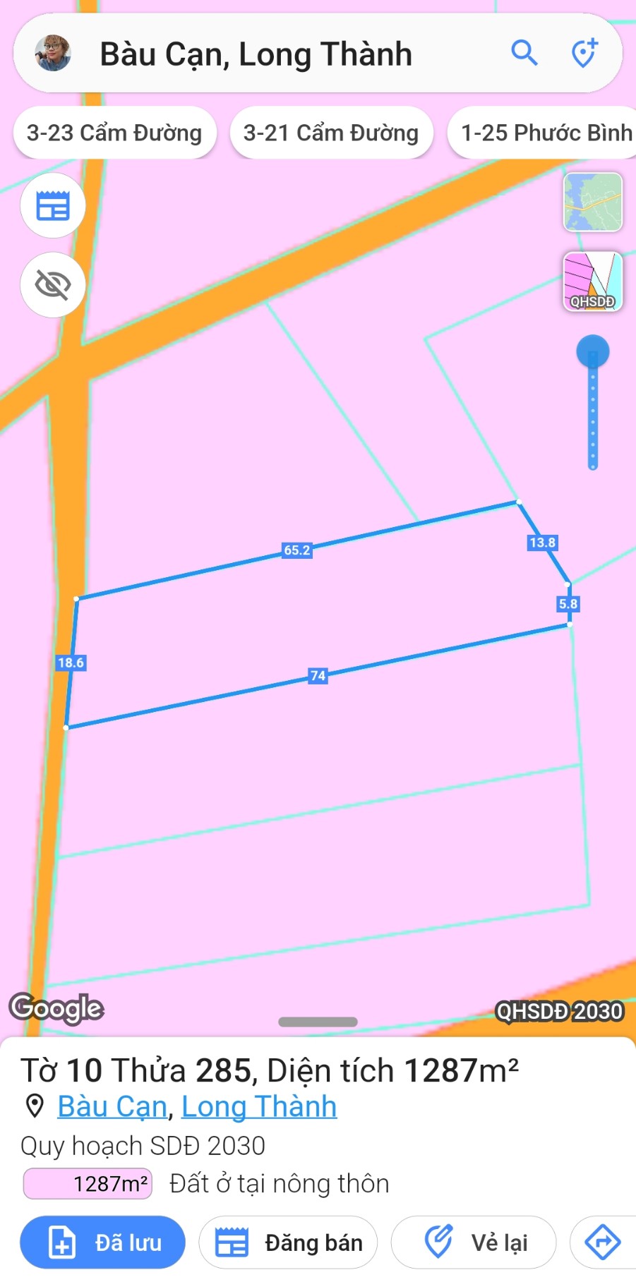 Chuyển nhượng 1287m2 đất đường hiện hữu, xã Bàu Cạn, huyện Long Thành. Giáp xã Cẩm Đường và xã Thừa Đức huyện Cẩm Mỹ. Đường thông thoáng xe hơi vào tận đất. Đất nở hậu nhẹ. Quy hoạch phủ hồng trọn diện tích sổ. Giá chuyển nhượng 3.000.000đ/m2 còn TL.