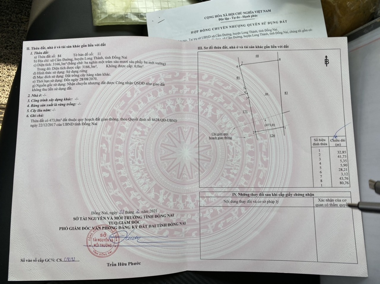 Tổng diện tích chuyển nhượng là 3166,3m2 sau lưng trường học và uỷ ban xã Cẩm Đường, huyện Long Thành.