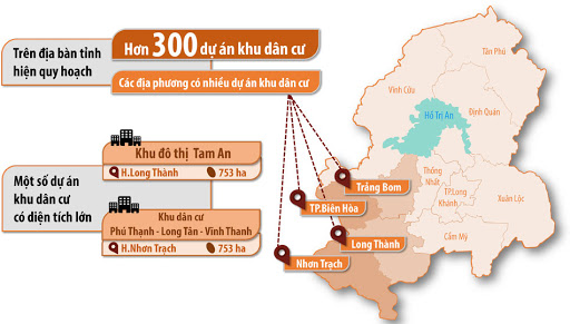 Trên địa bàn tỉnh có 3 địa phương quy hoạch nhiều dự án khu dân cư nhất tỉnh là H.Nhơn Trạch, H.Long Thành và TP.Biên Hòa. Trong kế hoạch sử dụng đất năm 2021 được UBND tỉnh phê duyệt thì 3 địa phương này có khoảng 259 dự án khu dân cư, khu đô thị với tổng diện tích là 8.361ha. Đây cũng là những khu vực có giá đất phi nông nghiệp, nông nghiệp chuyển nhượng khá cao. Trong đó, H.Nhơn Trạch có 84 dự án khu dân cư, khu đô thị với diện tích 3.838ha; H.Long Thành có 79 dự án, diện tích 3.176ha; TP.Biên Hòa 96 dự án có diện tích 1.347ha.