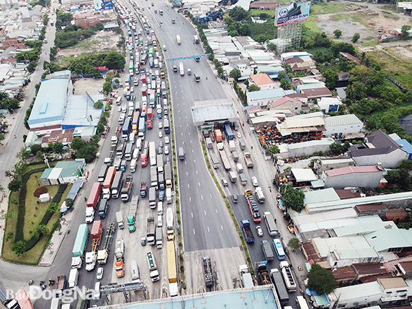 | Phương tiện nối hàng dài khi lưu thông qua Trạm thu phí BOT cầu Đồng Nai. Ảnh: T.Hải |