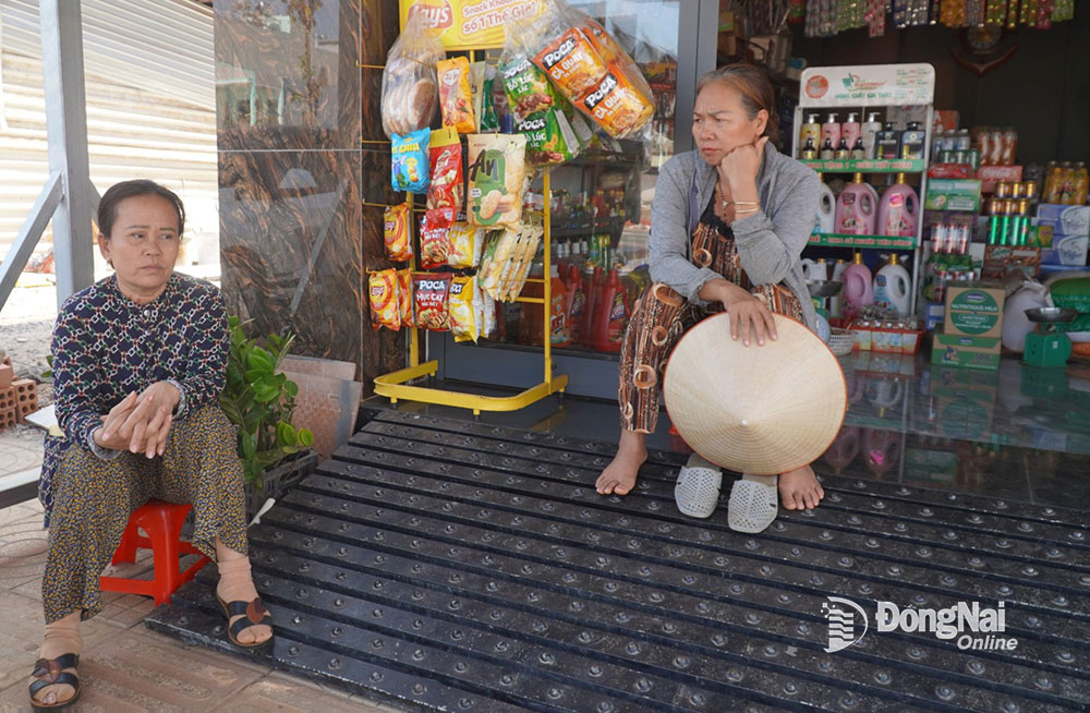 | Bà Trần Thị Mùi (bên trái) lo lắng khi quán tạp hóa, kế sinh nhai duy nhất của gia đình tại nơi ở mới khu tái định cư Lộc An - Bình Sơn ế ẩm. Ảnh: P.TÙNG |