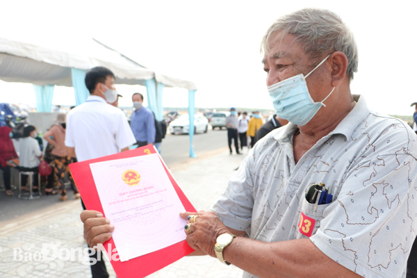 | Một hộ dân được cấp giấy chứng nhận quyền sử dụng đất của lô đất tái định cư tại khu tái định cư Lộc An - Bình Sơn. Ảnh: P.TÙNG |