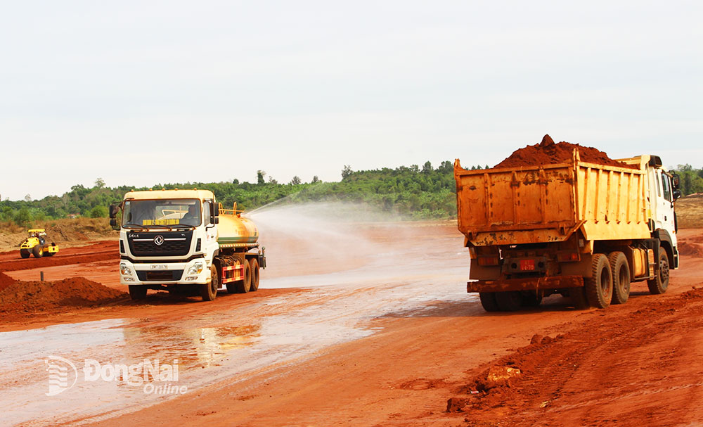 | Tưới nước giảm bụi khu vực thi công dự án Cảng hàng không quốc tế Long Thành. Ảnh: Ban Mai |
