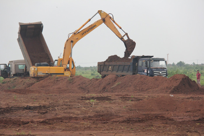 Cách đó không xa, trên công trường khu vực thi công nhà ga sân bay Long Thành, từng đoàn xe chở đất nối đuôi nhau chạy ngược xuôi để thi công san lấp.