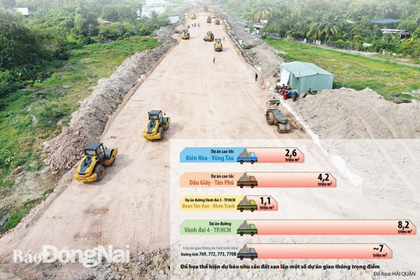 Về phía tỉnh, để xây dựng mạng lưới giao thông kết nối với cảng hàng không quốc tế (sân bay) Long Thành, 4 dự án giao thông trọng điểm cũng sẽ được triển khai thực hiện trong giai đoạn này gồm: các dự án Nâng cấp, mở rộng 3 tuyến đường tỉnh 769, 772, 773 và dự án Xây dựng mới đường tỉnh 770B. Theo dự báo, khi các dự án này được khởi động thực hiện, nhu cầu về nguồn đất san lấp phục vụ thi công là rất lớn.