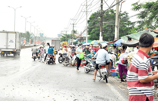 | Để đảm bảo an toàn giao thông trên quốc lộ 51 cần xử lý nghiêm tình trạng lấn chiếm hành lang đường bộ để buôn bán. Trong ảnh: Họp chợ trái phép trên quốc lộ 51 đoạn qua xã An Phước (H.Long Thành) |