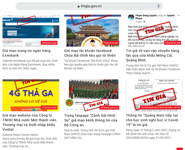 | Trung tâm Xử lý tin giả Việt Nam thuộc Cục Phát thanh - truyền hình và thông tin điện tử (Bộ TT-TT) liên tục “điểm danh” và công bố rộng rãi các website, trang mạng xã hội giả mạo cơ quan, tổ chức, doanh nghiệp; đồng thời, liên hệ với các bên liên quan để xử lý. Ảnh: Chụp màn hình |