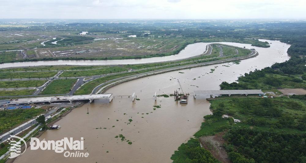 | Phần cầu phía bờ P.Tam Phước đang được thi công lao dầm cầu. |