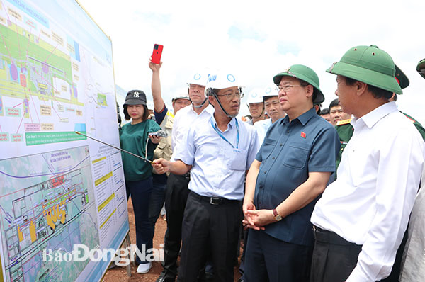 | Ủy viên Bộ Chính trị, Chủ tịch Quốc hội Vương Đình Huệ nghe báo cáo quy hoạch dự án Sân bay Long Thành giai đoạn 1 và hệ thống giao thông kết nối. Ảnh: Phạm Tùng |