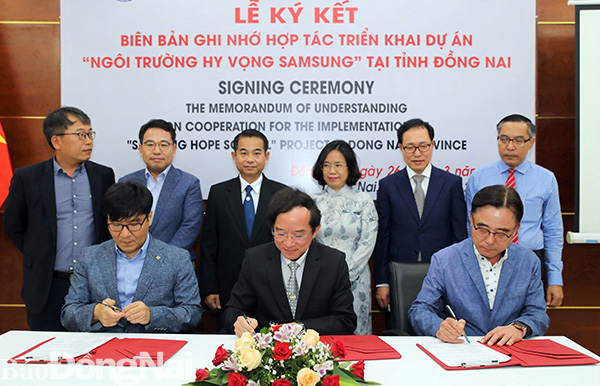 | Lễ ký kết biên bản ghi nhớ hợp tác triển khai dự án Ngôi trường Hy vọng Samsung tại Đồng Nai, giữa Liên hiệp các tổ chức hữu nghị tỉnh, Công ty TNHH Samsung Electronics Việt Nam và Tổ chức KFHI |