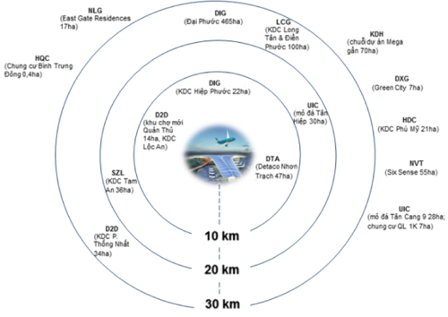 Bán kính 30 km quanh Long Thành có 15 doanh nghiệp địa ốc niêm yết. Nguồn: FPTS. |