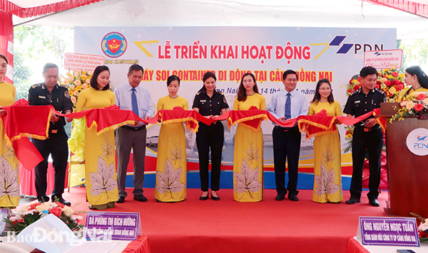 | Lãnh đạo Cục Hải quan và Cảng Đồng Nai cắt băng khai thương máy soi container. |