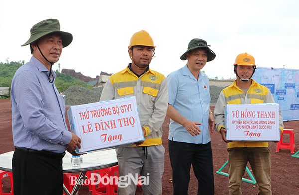 | Chủ nhiệm Ủy ban Kinh tế của Quốc hội Vũ Hồng Thành và Thứ trưởng Bộ GT-VT Lê Đình Thọ tặng quà động viên các đơn vị thi công. Ảnh: Phạm Tùng |