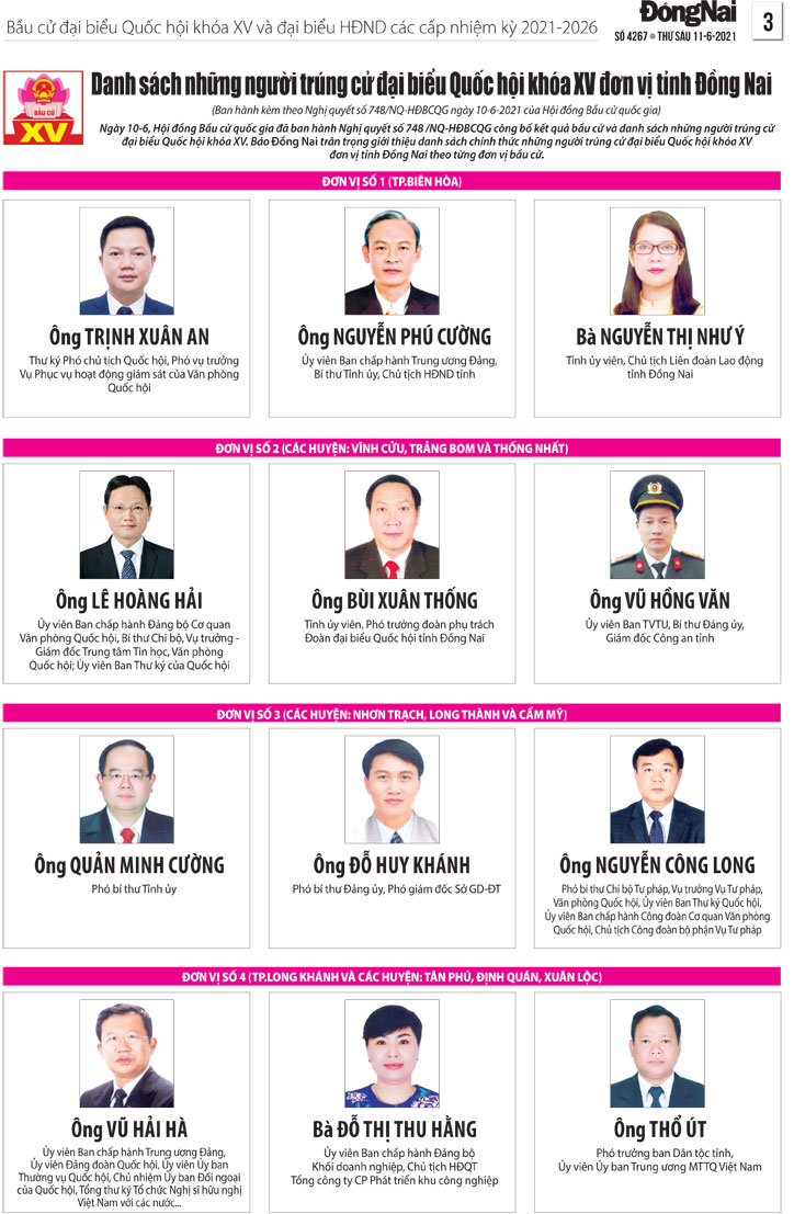 > Danh sách những người trúng cử đại biểu Quốc hội khóa XV đơn vị tỉnh Đồng Nai