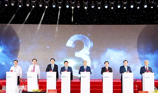| Thủ tướng Chính phủ Nguyễn Xuân Phúc và lãnh đạo các ban, bộ, ngành trung ương và tỉnh Đồng Nai nhấn nút khởi công dự án thành phần 3 thuộc dự án đầu tư xây dựng sân bay Long Thành giai đoạn 1. Ảnh: P.Tùng |