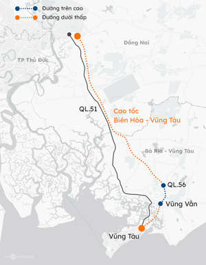 Phương án 3 là cao tốc 4 làn xe đi cao đoạn quốc lộ 56 - Vũng Vằn và đi thấp đoạn Vũng Vằn - Vũng Tàu, không kết hợp đường song hành đi thấp, vốn đầu tư dự kiến hơn 7.700 tỷ đồng.