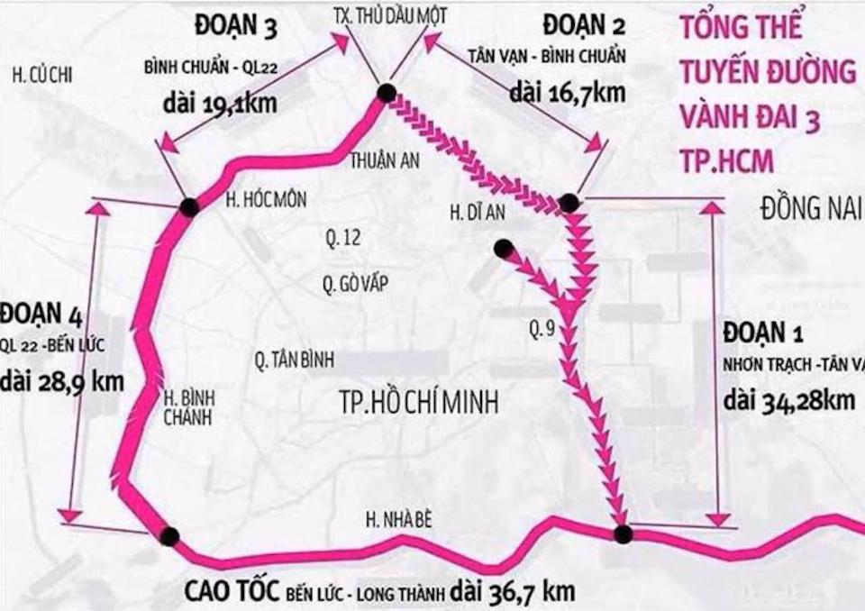 Dự án đầu tư xây dựng đường Vành đai 3 TP Hồ Chí Minh có tổng chiều dài 76,34km, đi qua bốn địa phương, bao gồm: Đoạn qua TP Hồ Chí Minh 47,51km; Đồng Nai 11,26km; Bình Dương 10,76km và Long An 6,81km.