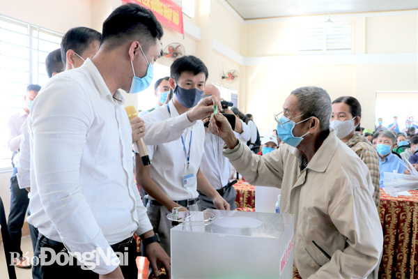 | Ông Trương Văn Bạch (bên phải) là chủ hộ đầu tiên bốc thăm vị trí, nhận đất tái định cư tại dự án Sân bay Long Thành. Ảnh:P. Tùng |