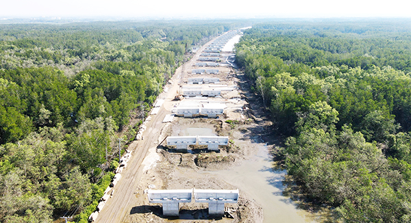 Ông Vũ Thanh Trà, Giám đốc ban điều hành gói thầu A7 cho biết, việc thi công qua rừng ngập mặn rất phức tạp khi nơi đây thường xuyên ngập nước do thủy triều. Ngoài ra, việc thi công cũng phải đáp ứng các yêu cầu về bảo vệ môi trường trong khu vực rừng ngập mặn.