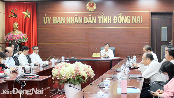 | Chủ tịch UBND tỉnh Cao Tiến Dũng và các sở, ngành liên quan tham dự tại điểm cầu Đồng Nai |