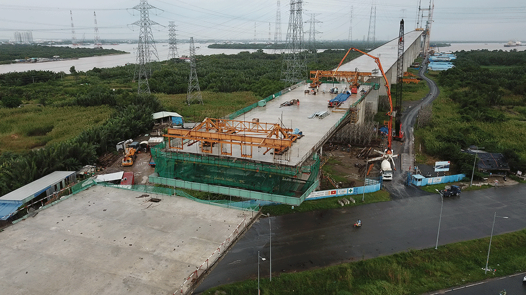 Thi công cầu Phước Khánh thuộc dự án đường cao tốc Bến Lức - Long Thành bắc qua sông Lòng Tàu nối H.Cần Giờ (TP.HCM) với H.Nhơn Trạch. Ảnh: P. Tùng