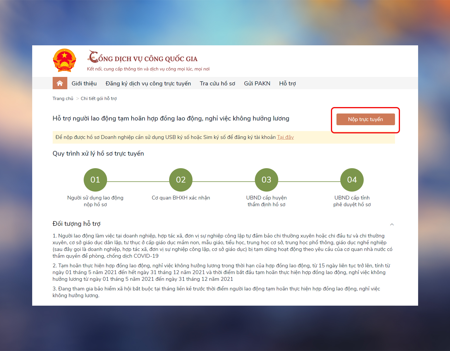 Cổng Dịch vụ công quốc gia cung cấp 5 dịch vụ công trực tuyến liên quan đến hỗ trợ người lao động gặp khó khăn do dịch bệnh COVID-19: