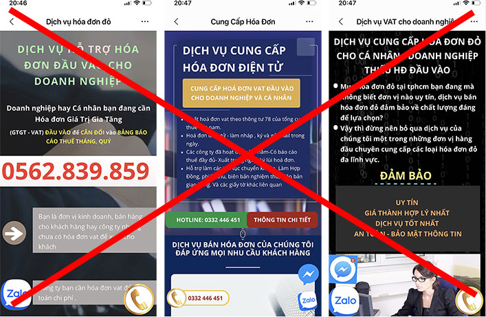 Là chủ DN mới thành lập năm 2022 về lĩnh vận tải, dù không có nhu cầu mua hóa đơn nhưng ông Trần Đức Cảnh (TP.Biên Hòa) thường xuyên nhận được những tin nhắn rao bán hóa đơn giá trị gia tăng từ nhiều số điện thoại lạ với những lời quảng cáo như: là công ty lâu năm, xuất hóa đơn đầu vào đầu ra đủ các ngành, chứng từ rõ ràng, chi phí giảm dần nếu mua hóa đơn số lượng lớn… Biết đây là những công ty “ma” và hành vi rao bán hóa đơn là vi phạm pháp luật nên ông Cảnh không đồng ý kết bạn cũng không tương tác với bên rao bán. Ông Cảnh cho biết, để công ty thực hiện đúng quy định của pháp luật, ông đã thuê một công ty kế toán chuyên nghiệp thực hiện kê khai, báo cáo thuế và xuất hóa đơn theo đúng quy định của pháp luật.