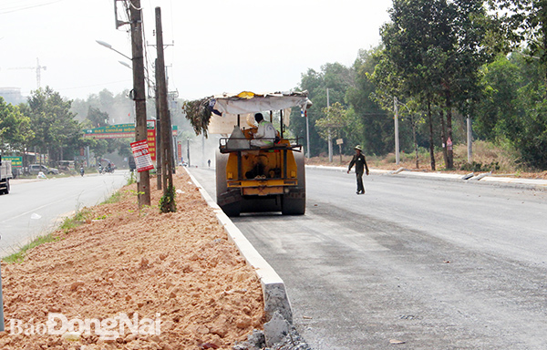 | Thi công mở rộng đường số 2 đoạn qua trung tâm hành chính H.Nhơn Trạch. Ảnh: Hoàng Lộc |