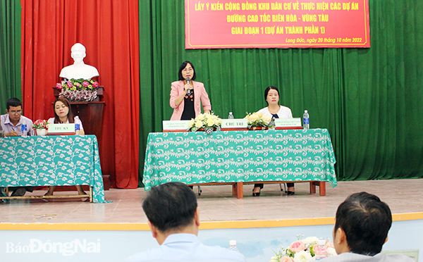 Tại hội nghị, Phó chủ tịch UBND tỉnh Nguyễn Thị Hoàng đã thông tin cơ bản về dự án thành phần 1 do UBND tỉnh làm chủ đầu tư. Dự án thành phần 1 (từ đường tránh Biên Hòa, P.Phước Tân đến xã Lộc An H.Long Thành) có chiều dài khoảng 16km, dự kiến khởi công ngày 30-6-2023 và đưa vào khai thác năm 2026.