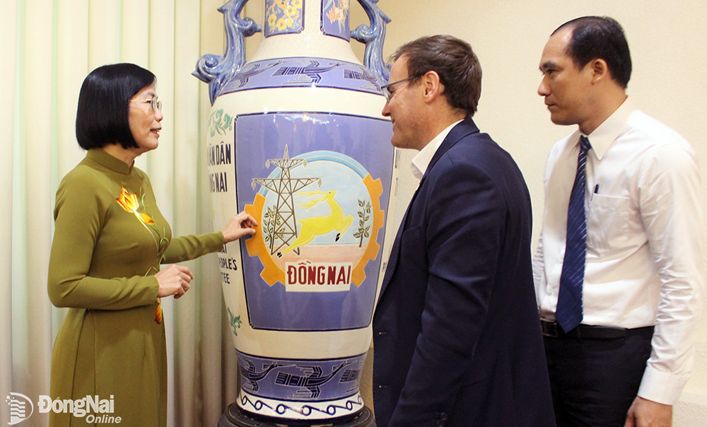 | Phó chủ tịch UBND tỉnh Nguyễn Thị Hoàng giới thiệu về gốm Đồng Nai cho ông David Gottlieb, Tham tán Kinh tế, Đại sứ quán Australia tại Việt Nam. Ảnh: V.GIA |