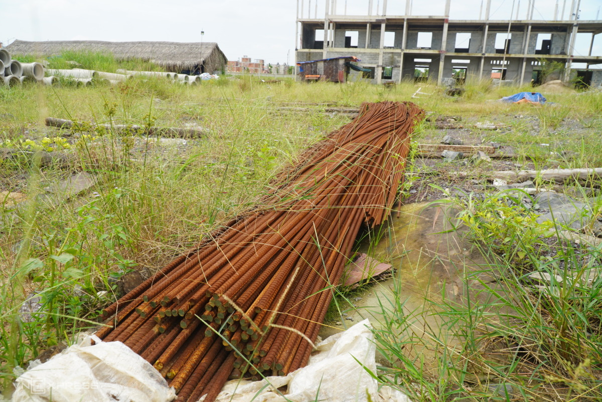 Nhiều bó thép rỉ sét vì phơi nắng mưa, nằm giữa khuôn viên công trình.