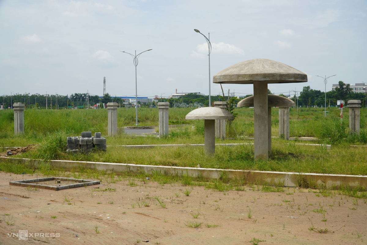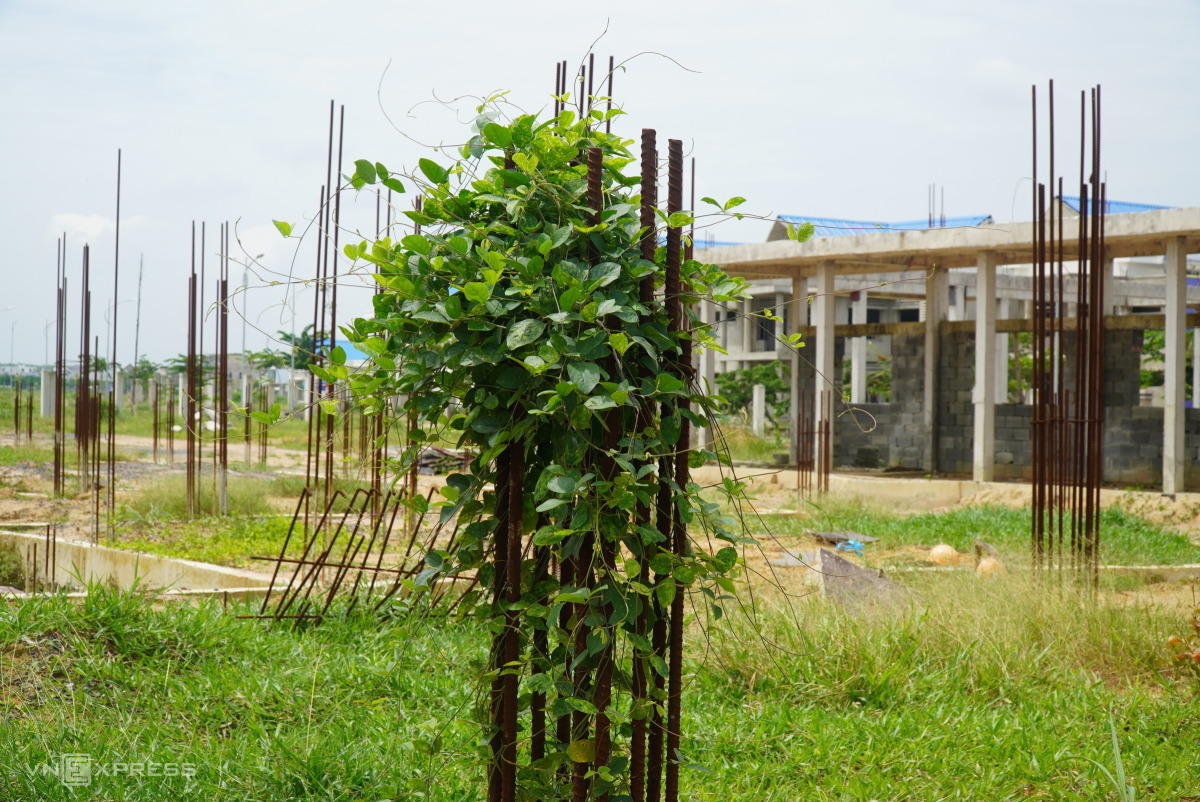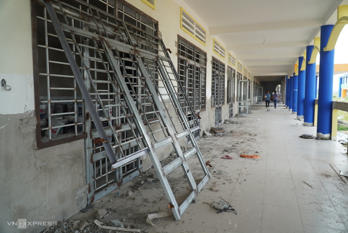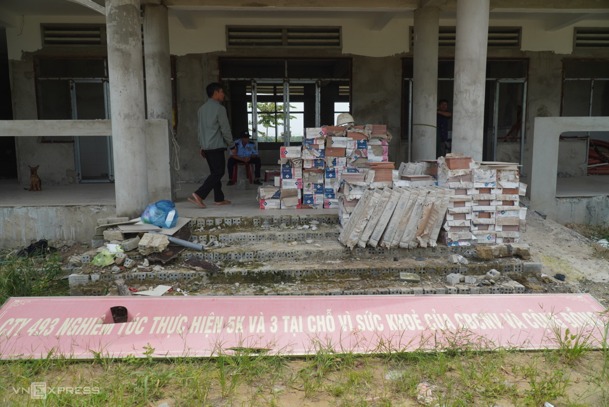 Tại trường tiểu học bên cạnh, cỏ mọc lên các cột thép đã gỉ. Đây là dự án hiếm hoi có công nhân ở lại lán trại trông coi nhưng chỉ thi công "cầm chừng".