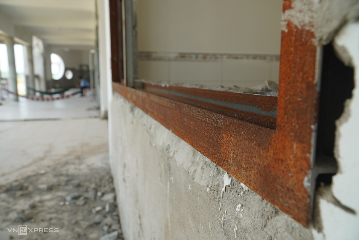 Các khung cửa sổ được làm bằng sắt, mặc dù ở bên trong công trình song vẫn bị rỉ sét, hư hỏng nặng.