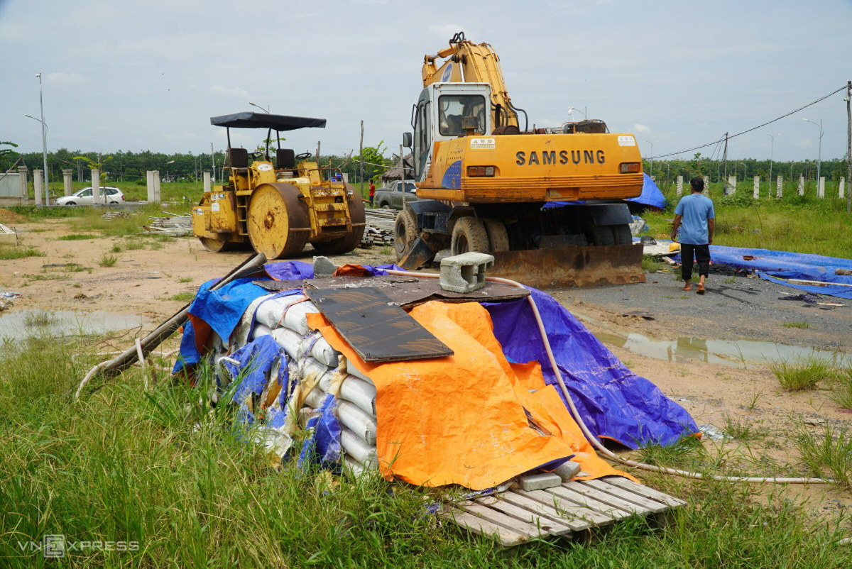 Máy móc nằm phơi nắng mưa giữa công trình trường tiểu học trong Khu tái định cư Lộc An - Bình Sơn.
