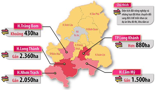 Theo UBND tỉnh, trong gần 9 năm tới (2021-2030), các địa phương trên của Đồng Nai sẽ chuyển đổi khoảng 7,2 ngàn ha đất nông nghiệp và những đất khác sang đất ở để triển khai các dự án KĐT, KDC. Trong đó, H.Long Thành sẽ tăng gần 2.360ha, H.Nhơn Trạch gần 2.050ha, H.Cẩm Mỹ gần 1,5 ngàn ha, TP.Long Khánh hơn 880ha và H.Trảng Bom khoảng 430ha.