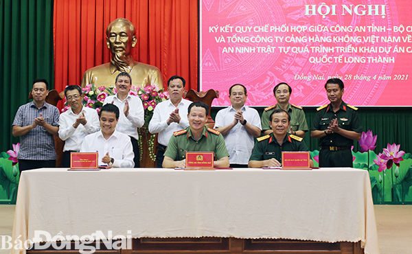 Chiều 28-4, Công an tỉnh đã chủ trì Hội nghị ký kết Quy chế phối hợp giữa Công an tỉnh - Bộ Chỉ huy quân sự tỉnh và Tổng công ty Cảng hàng không Việt Nam về công tác đảm bảo an ninh trật tự (ANTT) trong quá trình triển khai Dự án Cảng hàng không quốc tế Long Thành. Các đồng chí: Quản Minh Cường, Phó bí thư Tỉnh ủy; Võ Tấn Đức, Phó chủ tịch UBND tỉnh đã đến dự.