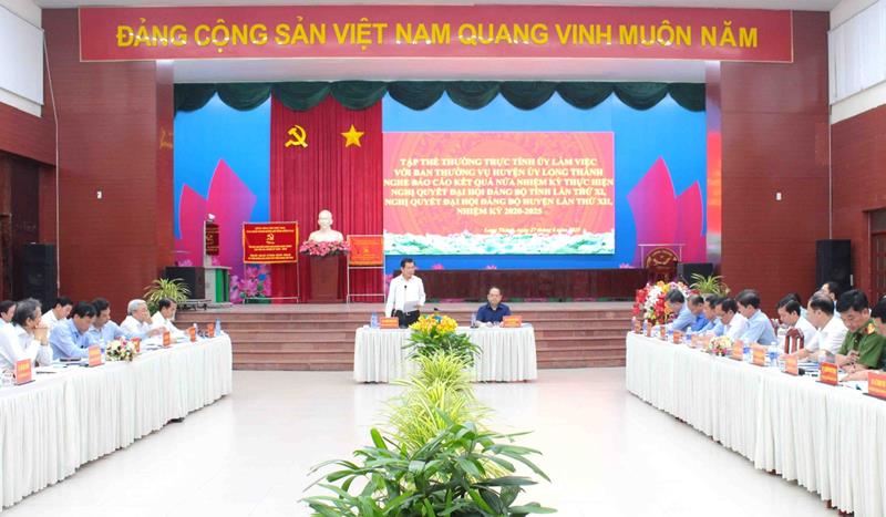 Báo cáo tại buổi làm việc, Ủy viên Ban TVTU, Bí thư Huyện ủy Long Thành Dương Minh Dũng cho biết, với sự nỗ lực và quyết tâm cao của cả hệ thống chính trị huyện, qua 2,5 năm thực hiện, đến nay, đối chiếu với các chỉ tiêu Nghị quyết Đại hội Đảng bộ tỉnh lần thứ XI, có 7/12 chỉ tiêu đạt và vượt, 5 chỉ tiêu đang trong lộ trình phấn đấu để thực hiện đạt vào cuối nhiệm kỳ; dự ước kết quả thực hiện đến năm 2025 các chỉ tiêu đều đạt và vượt kế hoạch.