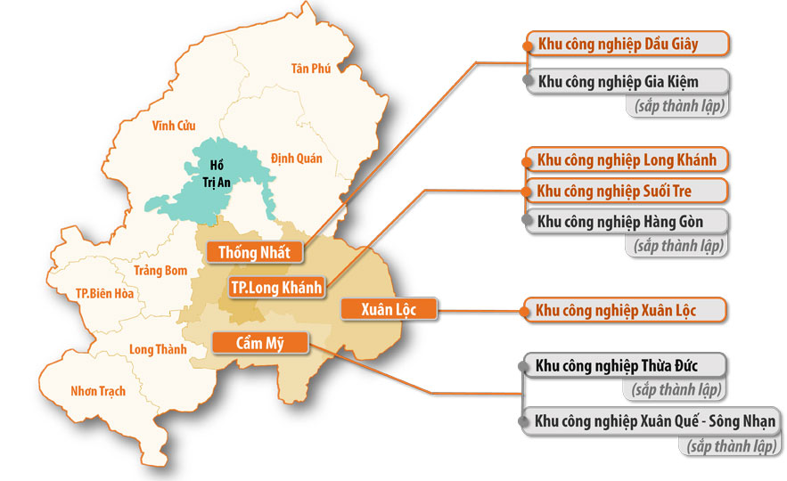 | Đồ họa thể hiện các khu công nghiệp hiện hữu và khu công nghiệp dự kiến thành lập tại các địa phương: Long Khánh, Xuân Lộc, Thống Nhất và Cẩm Mỹ. (Thông tin: Hương Giang - Đồ họa: Hải Quân) |
