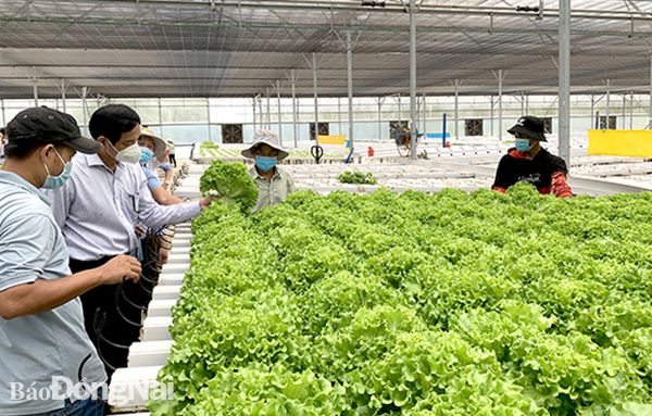 | Phó chủ tịch UBND tỉnh Võ Văn Phi (thứ 2 từ trái sang) tham quan mô hình nông nghiệp công nghệ cao WinEco Long Thành tại xã Long Phước (H.Long Thành). Ảnh: H.Lộc |