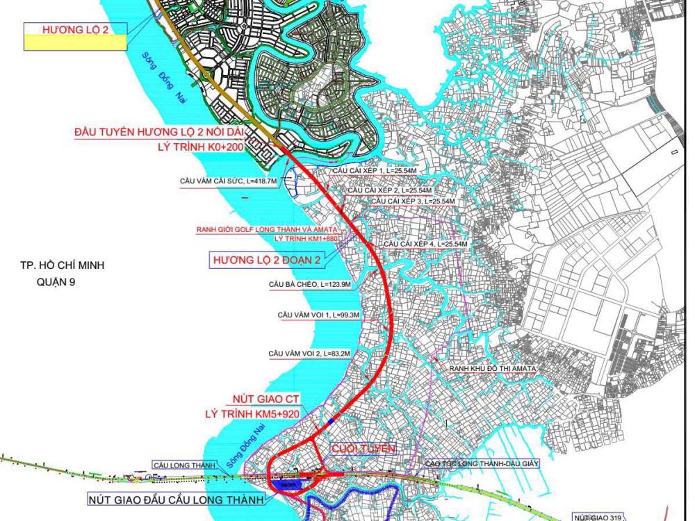 Tuyến hương lộ 2 kết nối từ quốc lộ 51 đến đường cao tốc TP.Hồ Chí Minh - Long Thành - Dầu Giây và được chia làm 3 dự án nhỏ. Với phần đường sẽ phân ra 2 đoạn: đoạn 1 dài 1,9km đầu tuyến nối từ quốc lộ 51 đến Khu đô thị Long Hưng; đoạn 2 dài hơn 8km từ Khu đô thị Long Hưng đến đường cao tốc TP.Hồ Chí Minh - Long Thành - Dầu Giây. Trên tuyến đường này còn xây dựng cầu Vàm Cái Sứt. Dự án có tổng mức đầu tư gần 1.500 tỉ đồng, trong đó kinh phí đền bù, giải phóng mặt bằng là khoảng 250 tỉ đồng