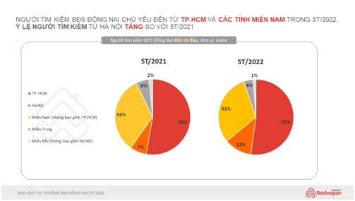 Báo cáo thị trường BĐS Đồng Nai trong 5 tháng đầu năm 2022 của Batdongsan.com.vn cho biết khách hàng quan tâm BĐS ở địa phương này chủ yếu đến từ TP. Hồ Chí Minh (chiếm 52%) và các tỉnh miền Nam (chiếm 31%). Tỷ lệ người tìm kiếm từ Hà Nội tăng 5% so với 5 tháng đầu năm 2021. Điều này được lý giải bởi nguồn cung tại TP. Hồ Chí Minh khan hiếm, quỹ đất ngày càng hạn hẹp khiến các nhà đầu tư, doanh nghiệp đổ về các thị trường vệ tinh mà nổi bật là Đồng Nai.
