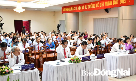 | Các đại biểu biểu quyết thông qua Nghị quyết thống nhất chủ trương và cam kết số vốn ngân sách địa phương bố trí một phần cho công tác bồi thường, giải phóng mặt bằng dự án đầu tư xây dựng đường cao tốc Biên Hòa- Vũng Tàu giai đoạn 1 |