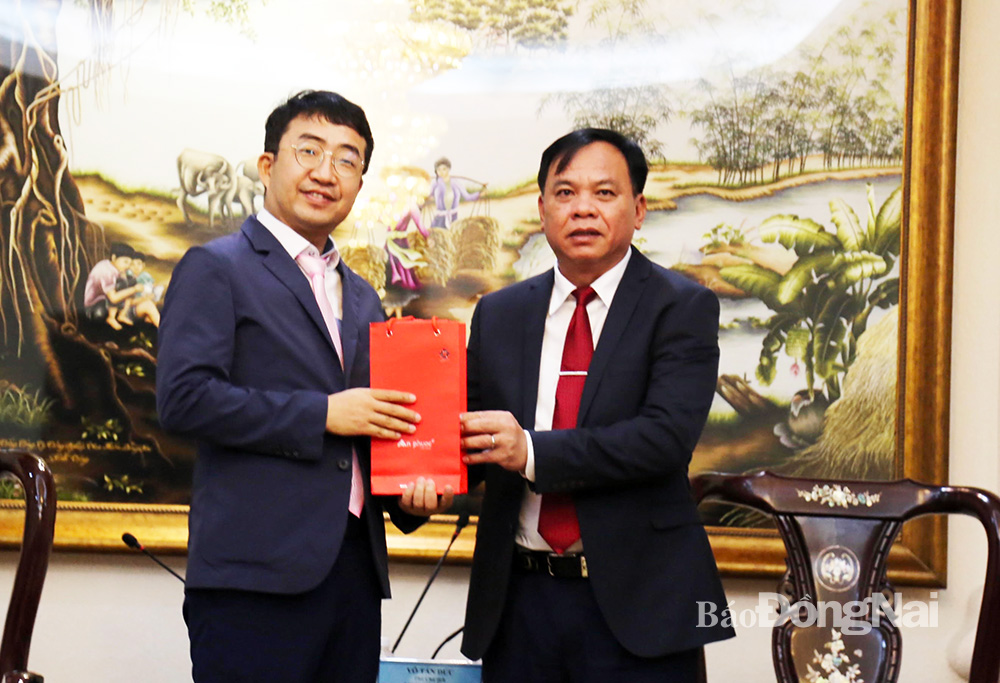 | Phó chủ tịch UBND tỉnh Võ Tấn Đức tặng quà lưu niệm cho ông Lee Jeong Man, Trưởng Văn phòng đại diện tỉnh Gyeongnam tại TP.HCM. Ảnh: C.Nghĩa |
