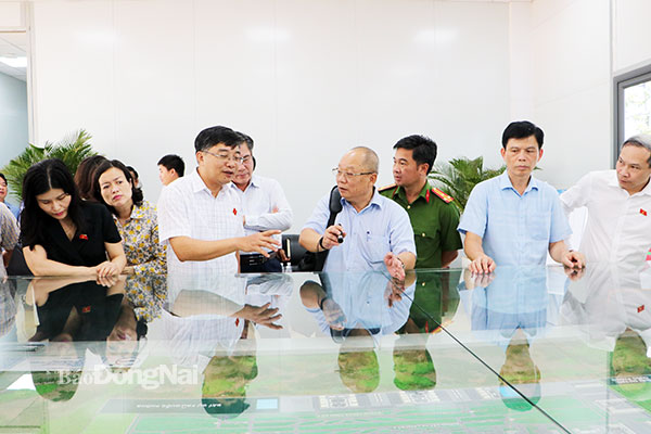 | Đoàn giám sát Ủy ban Kinh tế của Quốc hội nghe báo cáo tiến độ dự án sân bay Long Thành trên sa bàn dự án. Ảnh: Phạm Tùng |