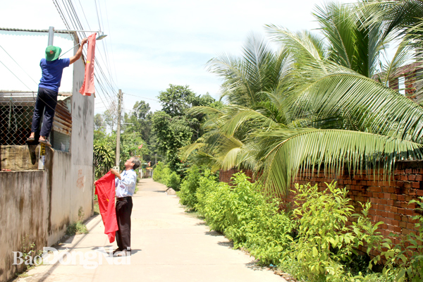 | Trên con đường hẻm sạch sẽ, nhân dân ấp 1, xã Tam An đang tiến hành thay mới cờ Tổ quốc để chuẩn bị chào đón lễ Quốc khánh 2-9 |