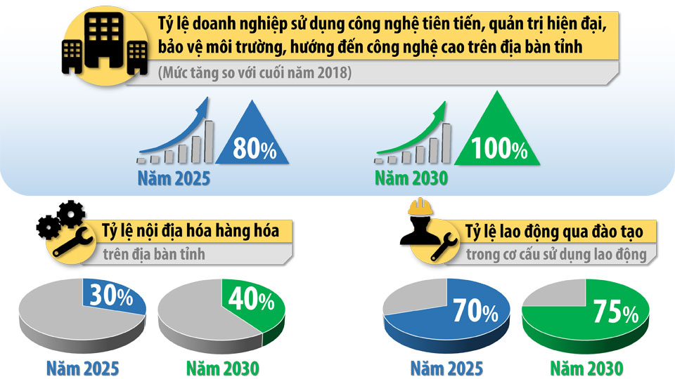 Trong thu hút FDI phấn đấu tỷ lệ DN sử dụng công nghệ tiên tiến, quản trị hiện đại, bảo vệ môi trường, hướng đến công nghệ cao trên địa bàn tỉnh tăng lên 80% vào năm 2025 (so với năm 2018) và 100% vào năm 2030 (so với năm 2018). Tỷ lệ nội địa hóa trên địa bàn tỉnh chiếm trên 30% vào năm 2025 và trên 40% vào năm 2030. Tỷ lệ lao động qua đào tạo trong cơ cấu sử dụng lao động chiếm 70% vào năm 2025 và 75% vào năm 2030.